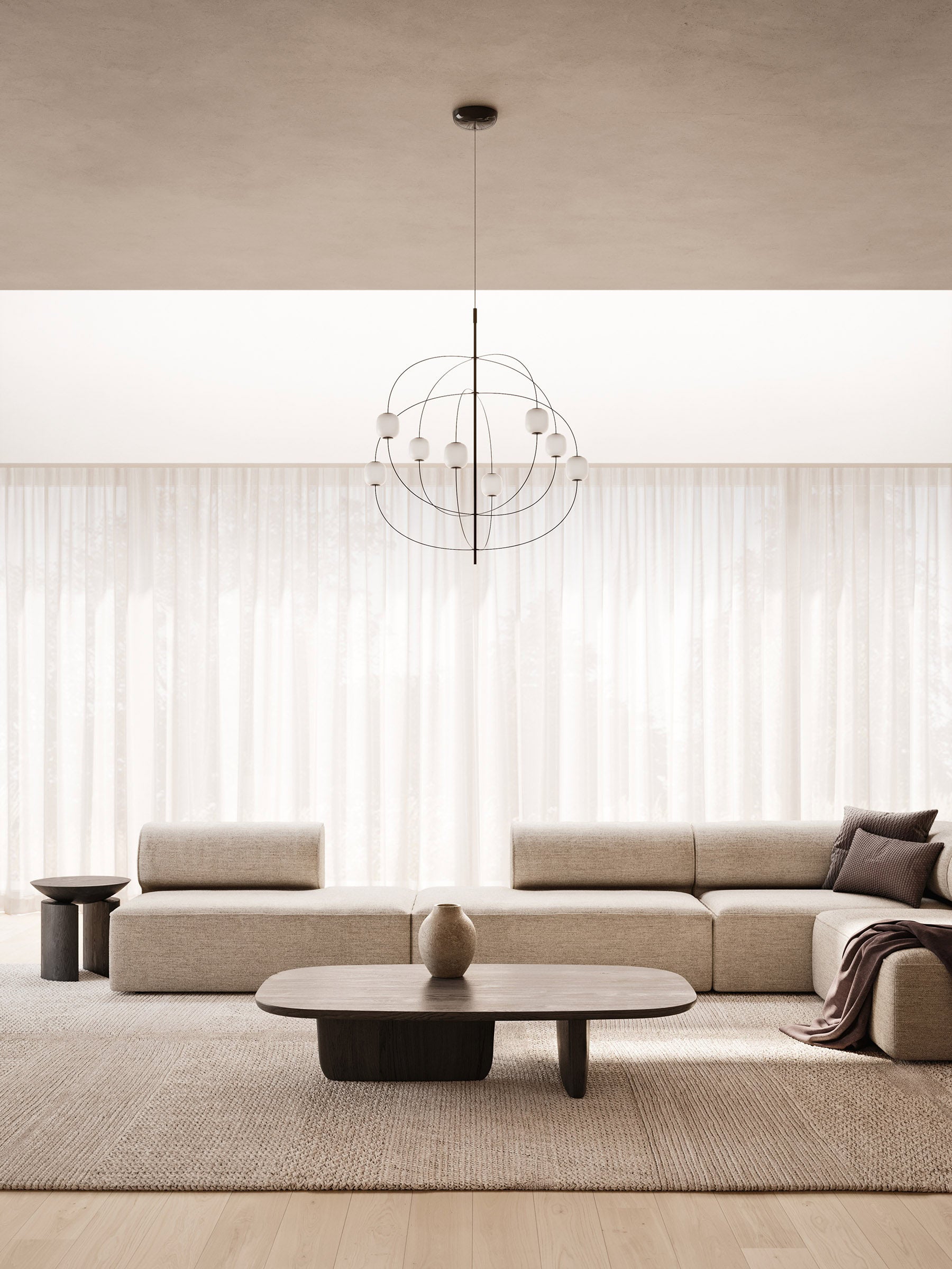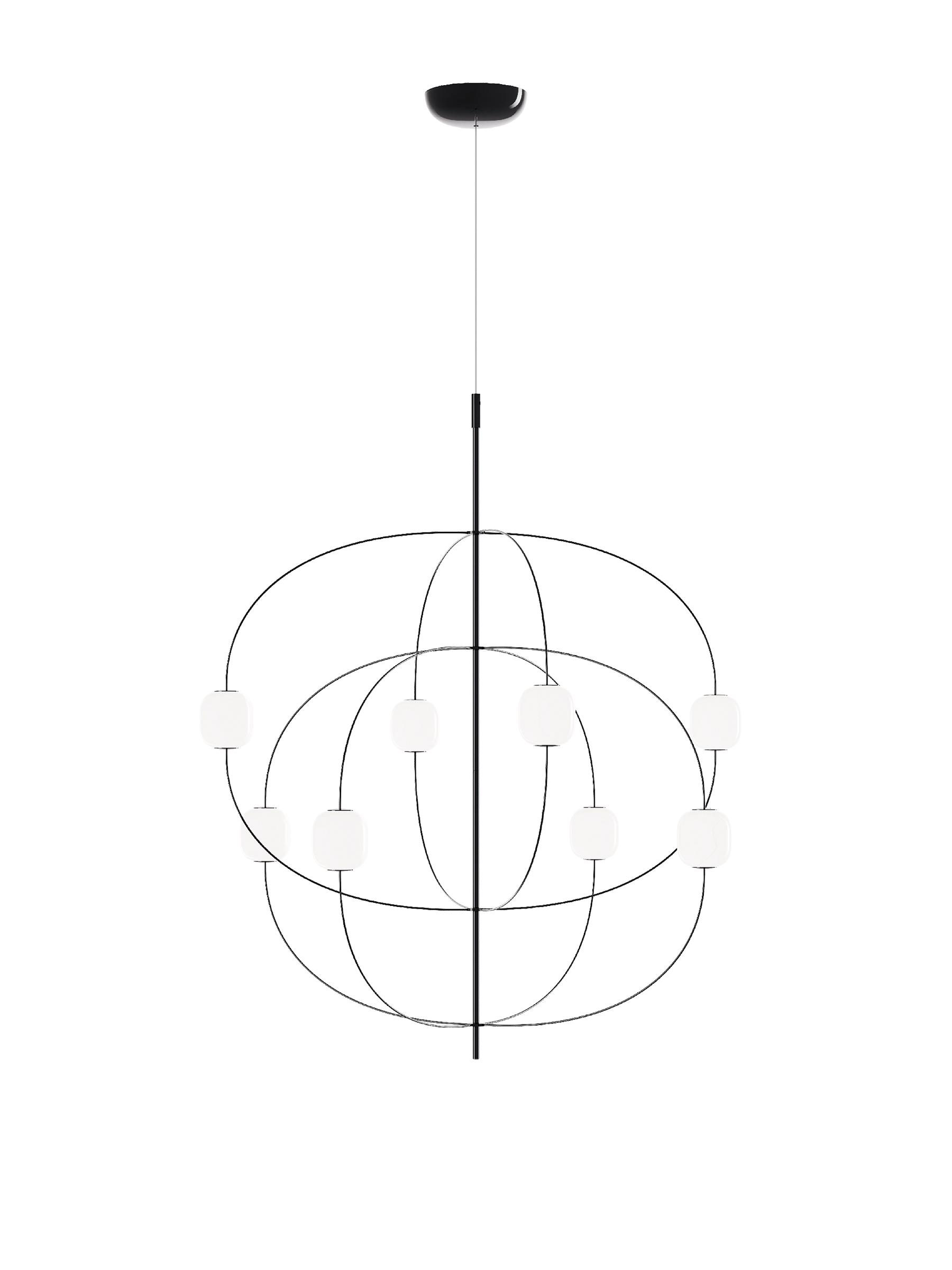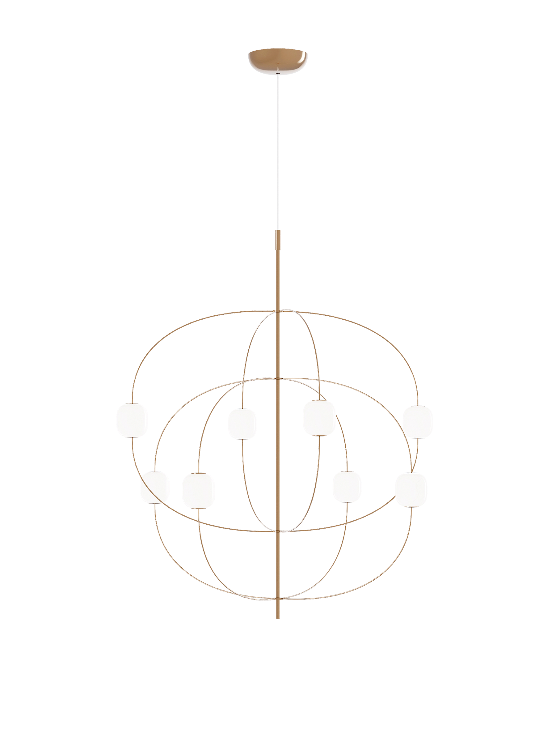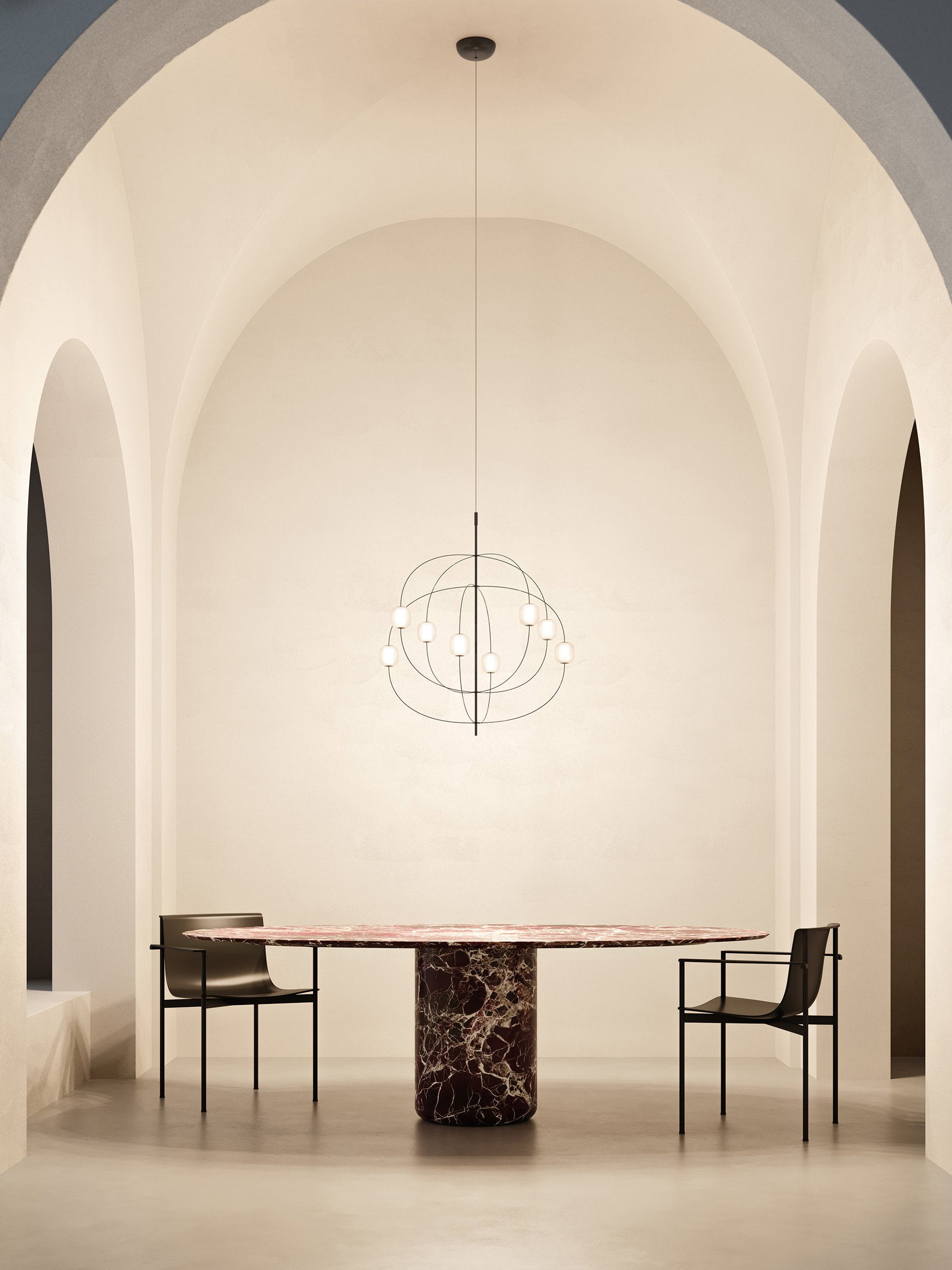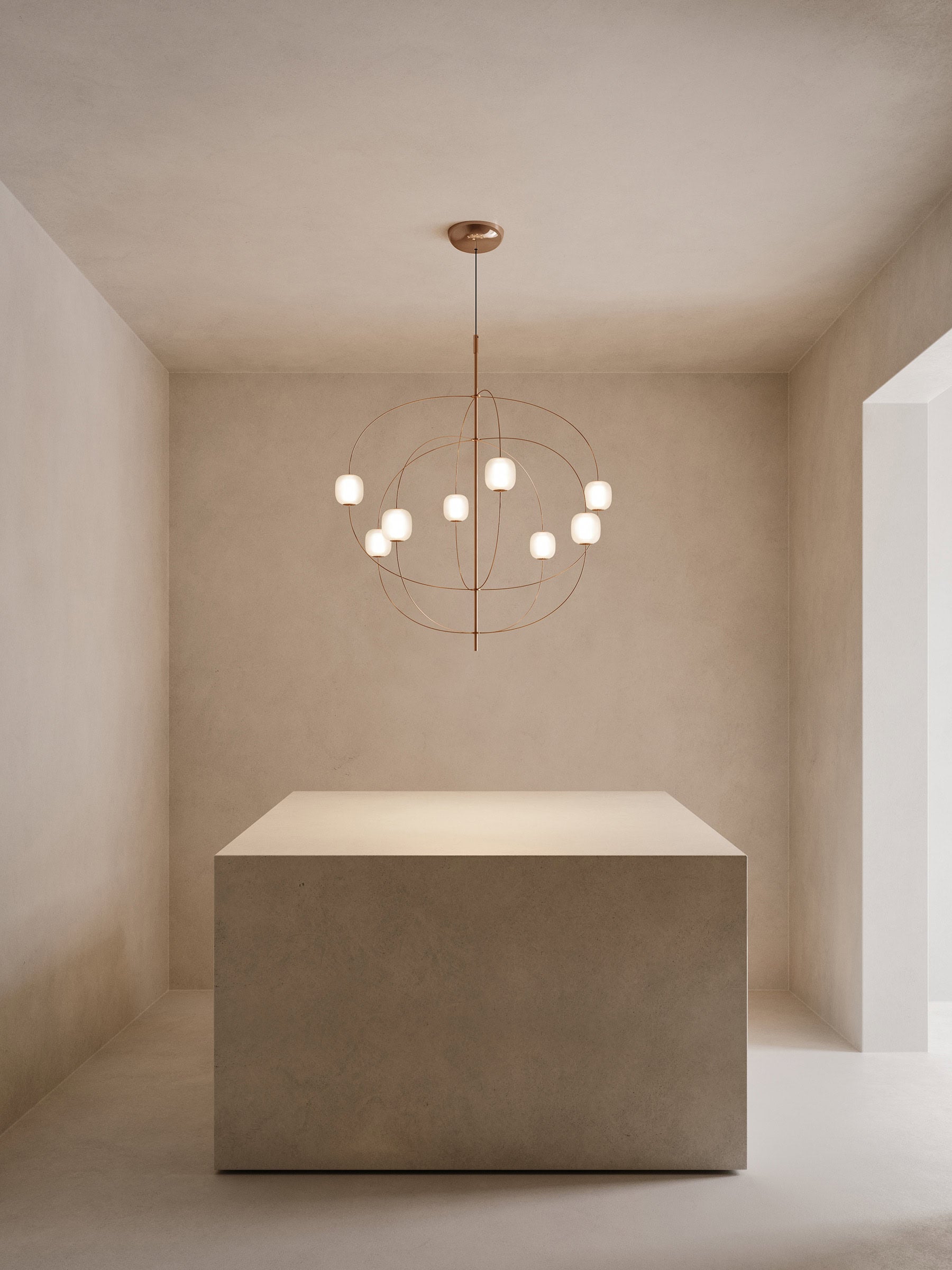 Axia is een vrijstaande hanglamp met een opvallende uitstraling die het archetype van de kroonluchter op een eigentijdse manier herinterpreteert. Het subtiele en doorlopende ontwerp laat licht, technologie en decoratieve elementen samensmelten tot een klein systeem van orde en vrijheid.