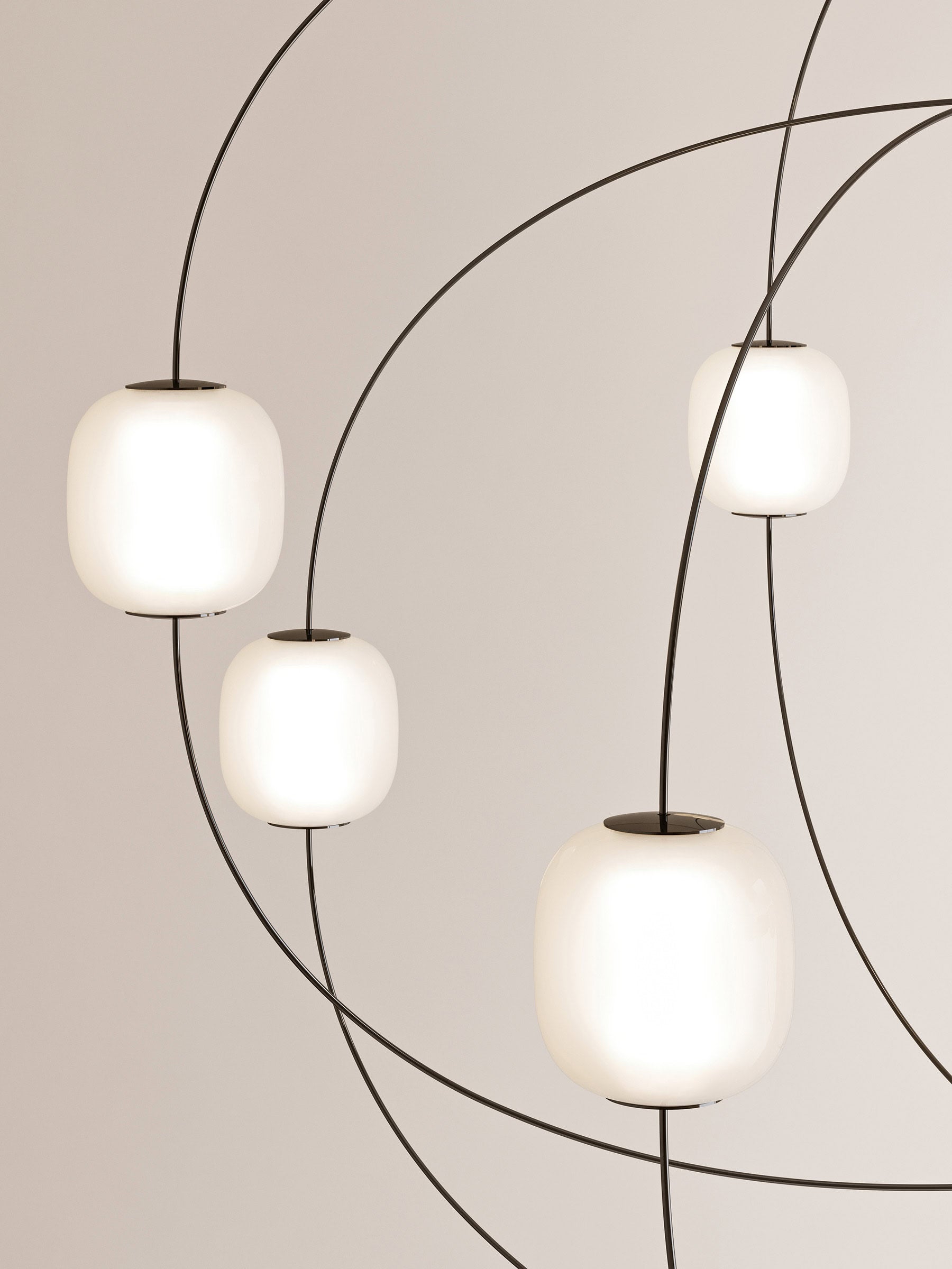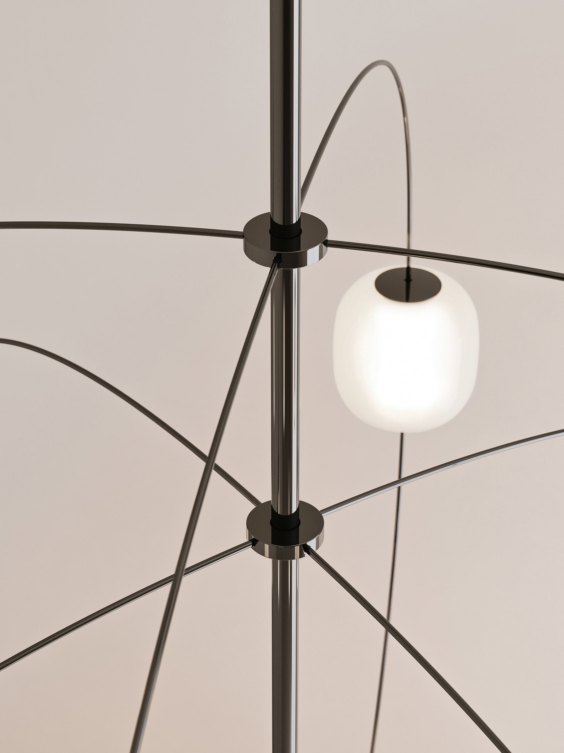 De lamp heeft een centrale as die als geleider fungeert en de armen voedt die zich als onderling verbonden elementen vertakken: het licht is dus niet langer gebonden aan een kabel, maar stroomt door de structuur zelf, wat de visuele puurheid van het ontwerp versterkt.