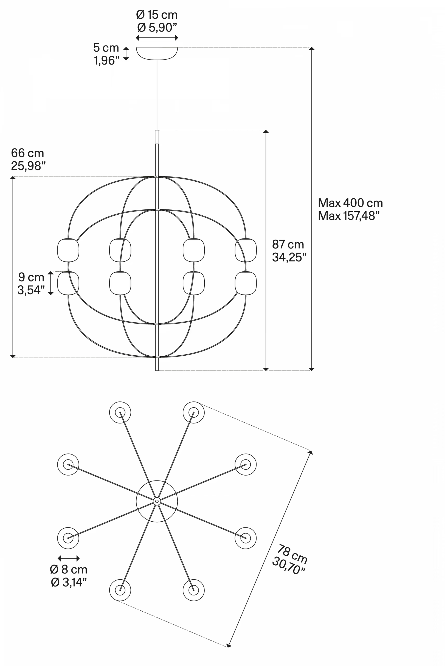 Axia is verkrijgbaar in één maat en in de afwerkingen Glanzend Brons en Zwart Chroom. De lamp is minimalistisch maar zeer opvallend, zelfs wanneer hij uitgeschakeld is. Hij past perfect in woonomgevingen, boven eettafels of in ruime woonkamers, maar ook in zakelijke en horecagelegenheden.